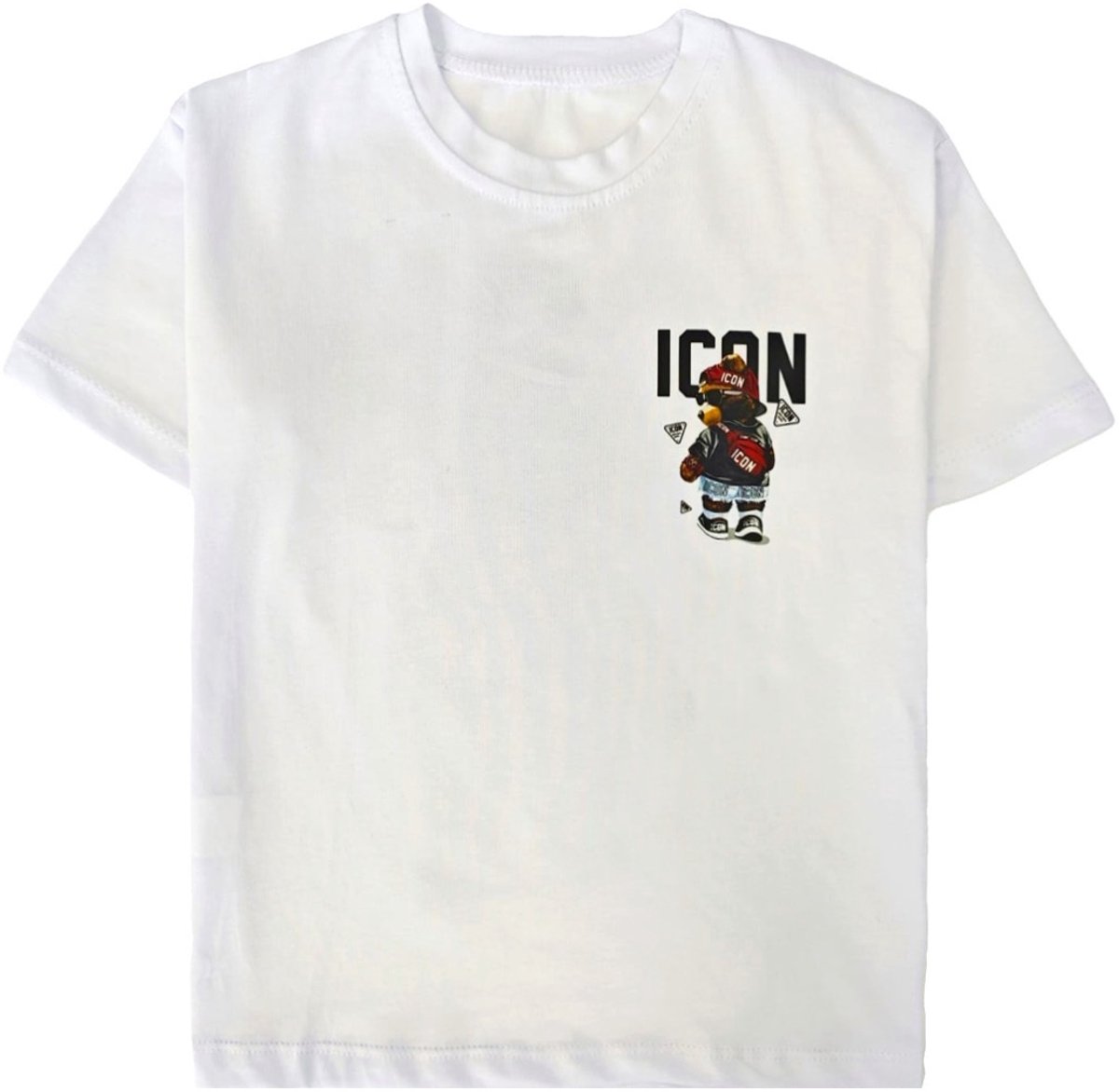 Laat jouw kind stralen met dit stoere en stijlvolle “ICON Bear” T-shirt! Dit witte kinder T-shirt combineert ultiem comfort met een opvallend design. De dubbelzijdige full color print van een coole beer met zonnebril, cap en sneakers maakt dit shirt tot een absolute eyecatcher.